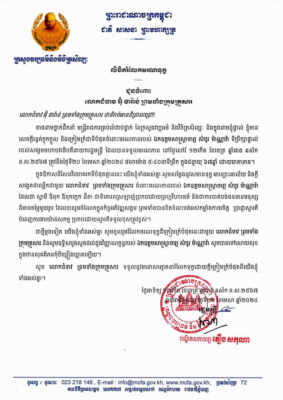 យើងខ្ញុំទាំងអស់គ្នាសូមចូលរួមរំលែកមរណទុក្ខដ៏សែនក្រៀមក្រំបំផុតនេះជាមួយ លោកជំទាវ ព្រមទាំងបុត្រ និងសូមឧទ្ទិសបួងសួងដល់ដួងវិញ្ញាណក្ខន្ធរបស់ សពឯកឧត្តម សាស្ត្រាចារ្យ សំបូរ មាណ្ណារ៉ា សូមបានទៅសោយសុខក្នុងឋានសុគតិភព កុំបីឃ្លៀងឃ្លាតឡើយ។