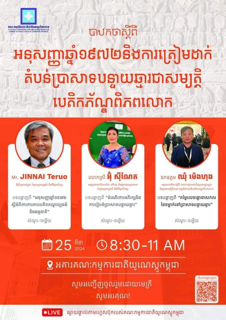 គណៈកម្មាធិការជាតិបេតិកភណ្ឌពិភពលោកកម្ពុជាសូមជូនដំណឹងដល់សាធារណជនជាតិ និងអន្តរជាតិឱ្យបានជ្រាបថា យើងខ្ញុំនឹងរៀបចំបាឋកថាក្រោមប្រធានបទ “អនុសញ្ញាឆ្នាំ១៩៧២ និងការរៀបចំត្រៀមដាក់តំបន់ប្រាសាទបន្ទាយឆ្មារជាសម្បត្តិបេតិកភណ្ឌពិភពលោក” នាថ្ងៃចន្ទ ទី២៥ ខែមីនា ឆ្នាំ២០២៤ នៅអាគារគណៈកម្មការជាតិយូណេស្កូកម្ពុជា វេលាម៉ោង៨: ៣០ នាទី ដល់ម៉ោង ១១:០០ ព្រឹក។