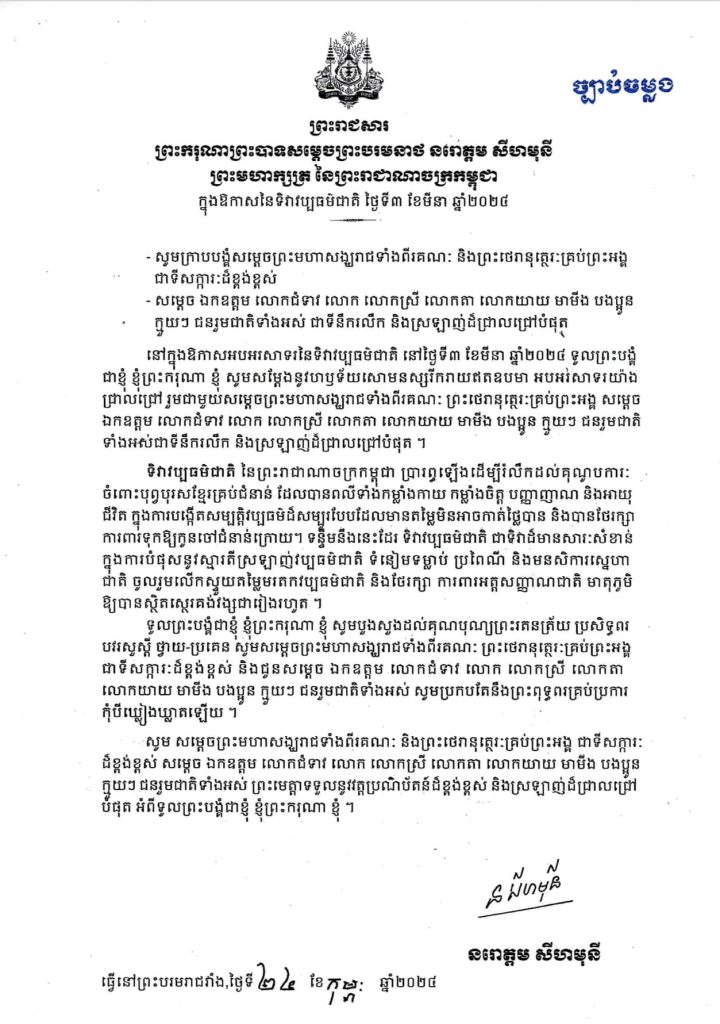 ព្រះរាជសារដ៏ថ្លៃថ្លារបស់ ព្រះករុណា ព្រះបាទសម្តេចព្រះបរមនាថ នរោត្តម សីហមុនី ព្រះមហាក្សត្រនៃព្រះរាជាណាចក្រកម្ពុជា ជូនជនរួមជាតិ ក្នុងឱកាសដ៏វិសេសវិសាលនៃទិវាវប្បធម៌ជាតិ ៣មីនា លើកទី២៦ ឆ្នាំ២០២៤
