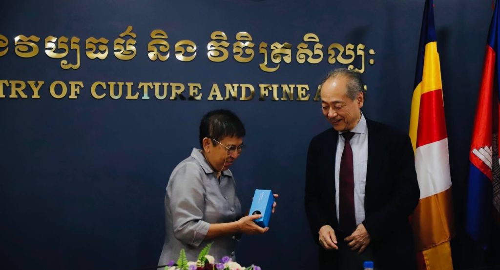 នាព្រឹកថ្ងៃទី០៥ ខែមេសា ឆ្នាំ២០២៤ នៅទីស្តីការក្រសួងវប្បធម៌និងវិចិត្រសិល្បៈ លោកជំទាវបណ្ឌិតសភាចារ្យរដ្ឋមន្ត្រី ទទួលជួបឯកឧត្តម តាកាហាស៊ី ហ្វូមីអាគី (Takahashi Fumiaki) ប្រធានសមាគមជប៉ុន-កម្ពុជា (JCA) និងជាអតីតឯកអគ្គរាជទូតជប៉ុនប្រចាំកម្ពុជារួមជាមួយសហការី ដើម្បីសម្តែងការគួរសម និងពិភាក្សាការងារលើវិស័យវប្បធម៌។