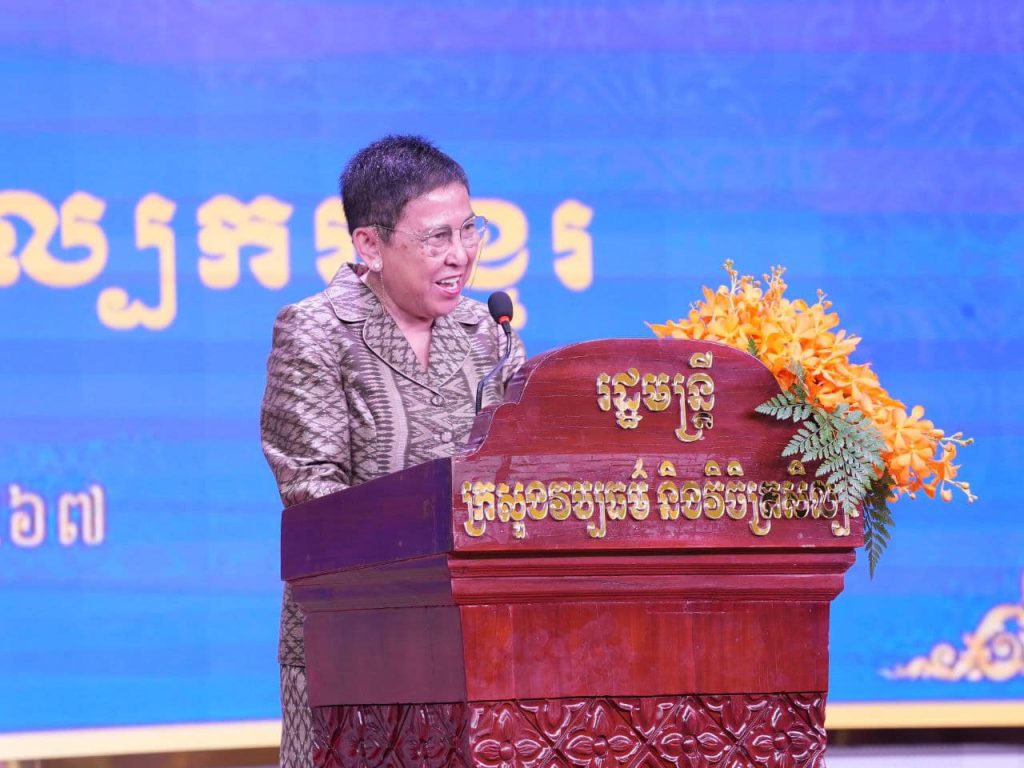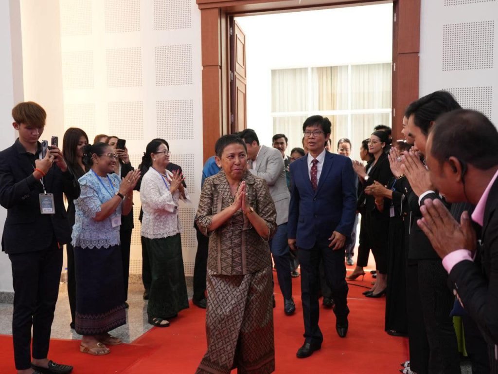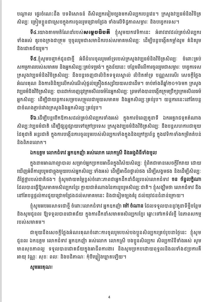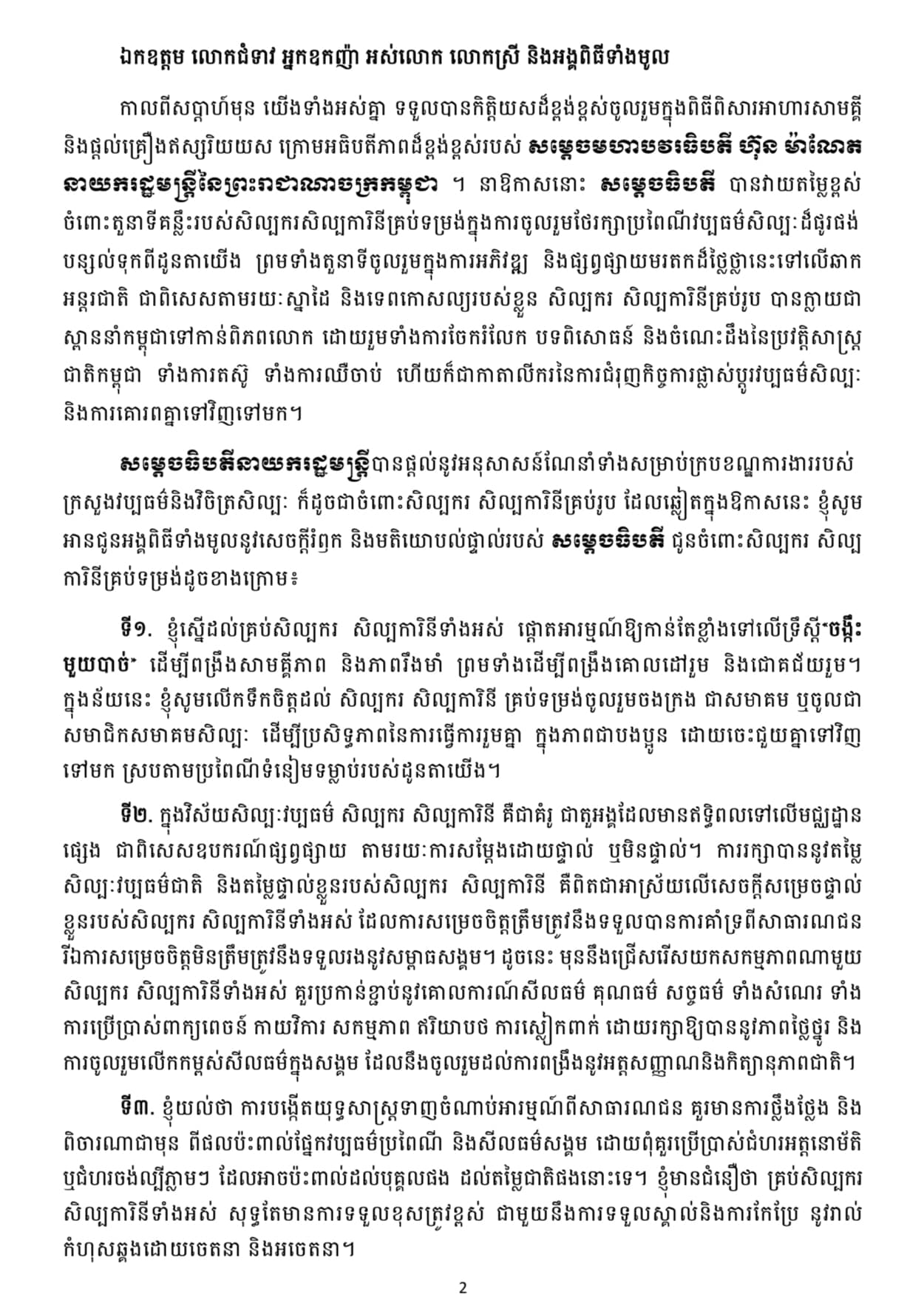 ថ្លែងក្នុងឱកាសនោះ លោកជំទាវបណ្ឌិតសភាចារ្យរដ្ឋមន្រ្តីបានមានប្រសាសន៍ថា ក្នុងនាមជាអាណាព្យាបាលសម្រាប់អ្នកប្រកបអាជីពក្នុងវិស័យសិល្បៈ ខ្ញុំពិតជាមានសេចក្តីរីករាយដោយឃើញអំពីការរួបរួមជាធ្លុងមួយរបស់អ្នកសិល្បៈទាំងអស់ដើម្បីបម្រើអាជីពខ្លួនផង ដើម្បីបម្រើសង្គមផង និងដើម្បីបម្រើសិល្បៈដ៏ថ្លៃថ្លារបស់ជាតិផង។ ខ្ញុំសូមវាយតម្លៃខ្ពស់ចំពោះភាពជាអ្នកដឹកនាំដ៏ល្អរបស់លោកជំទាវ ចន ច័ន្ទលក្ខិណា ដែលបានធ្វើឲ្យសមាគមសិល្បករខ្មែរក្លាយជាតំណាងនៃការរួបរួមសិល្បៈជាតិ ហើយខ្ញុំសង្ឈឹមថា លោកជំទាវនឹងបន្តរួមចំណែកផ្តល់ការជួយជ្រោមជ្រែងសមាគមនេះ និងជារៀមច្បងគំរូដល់យុវជនជំនាន់ក្រោយ។ ជាមួយនេះ ខ្ញុំក៏សូមអបអរសារ លោកជំទាវអ្នកឧកញ៉ា ម៉ៅ ចំណាន ដែលទទួលបាននូវតួនាទីថ្មីបន្ថែមទៀត និងសូមជូនពរឲ្យទទួលបានជោគជ័យក្នុងការដឹកនាំសមាគមសិល្បករខ្មែរឆ្ពោះទៅរកទំព័រថ្មី នៃភាពសកម្មរបស់សមាគម។