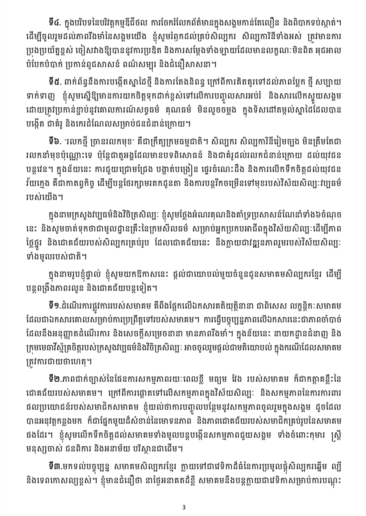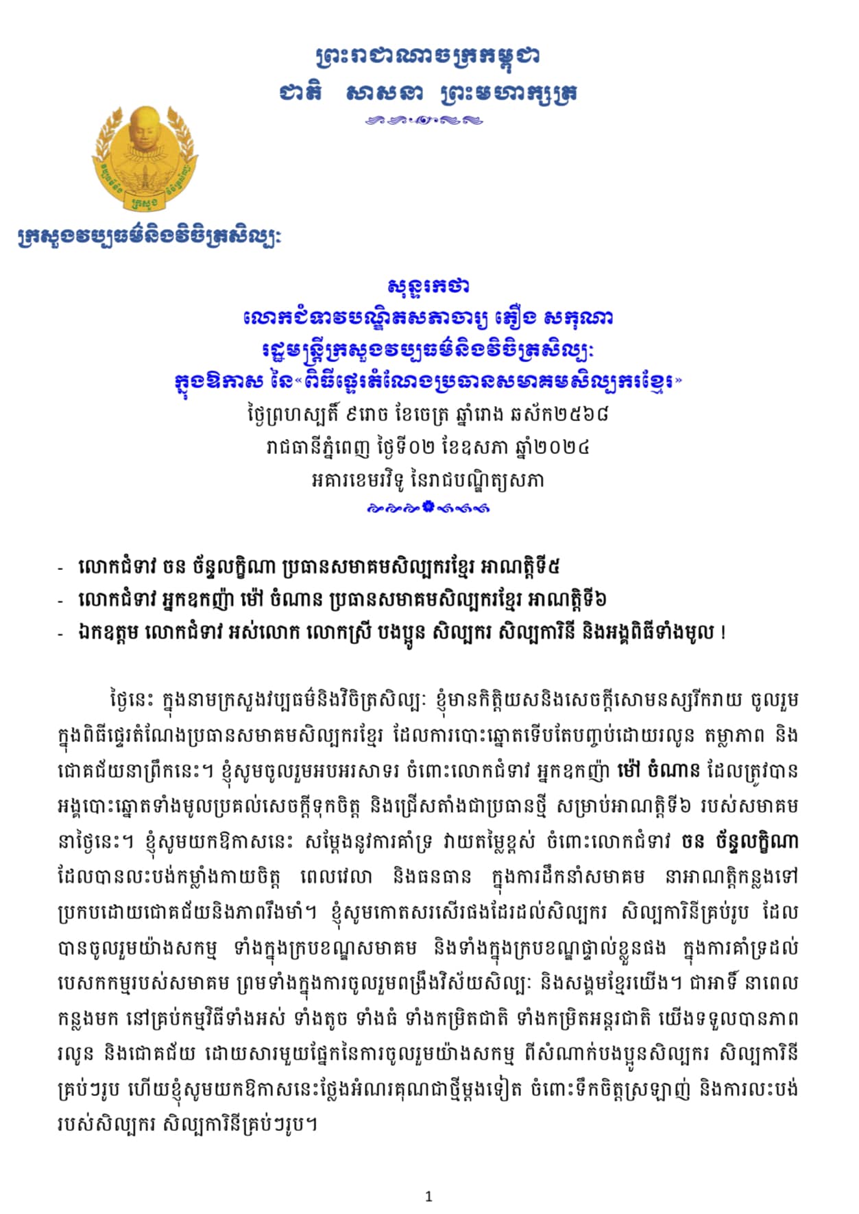 នាព្រឹកថ្ងៃទី២ ខែឧសភា ឆ្នាំ២០២៤ នៅរាជបណ្ឌិត្យសភាកម្ពុជា លោកជំទាវបណ្ឌិតសភាចារ្យ ភឿង សកុណា រដ្ឋមន្រ្តីក្រសួងវប្បធម៌ និងវិចិត្រសិល្បៈ បានអញ្ជើញផ្តល់កិត្តិយសចូលរួមជាអធិបតីក្នុងពិធីប្រកាសផ្ទេរតំណែងប្រធានសមាគមសិល្បករខ្មែរអាណត្តិទី៦ ក្រោមវត្តមានអញ្ជើញចូលរួមពីសំណាក់ឯកឧត្តម លោកជំទាវ អ្នកឧកញ៉ា លោក លោកស្រី តំណាងក្រសួងស្ថាប័ន ព្រមទាំងសិល្បករ សិល្បការិនីសរុបជាង៦០០នាក់។