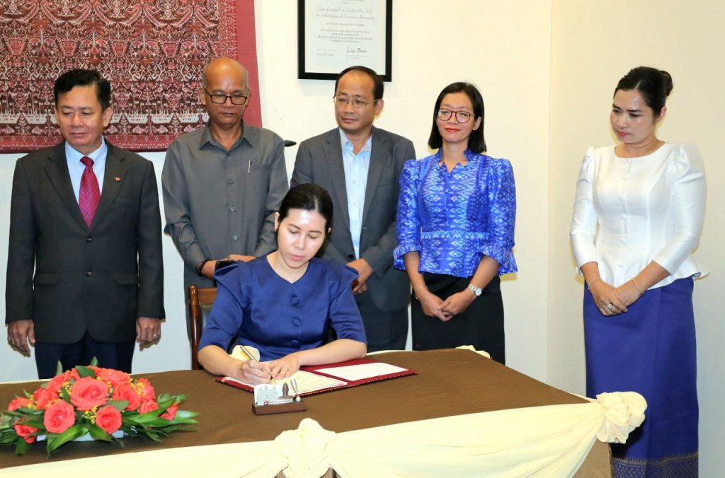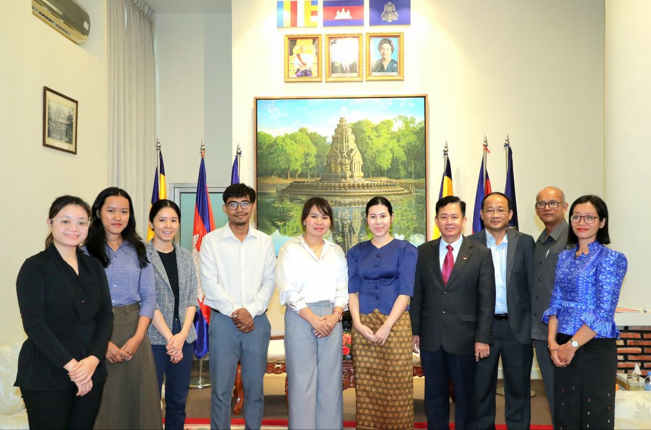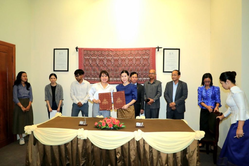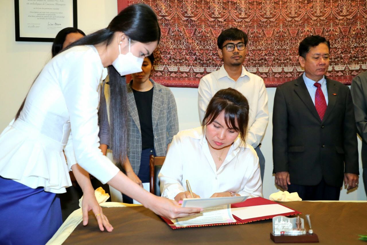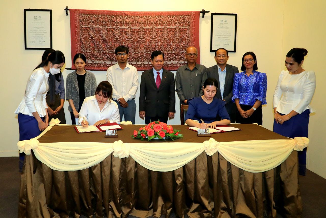 នាព្រឹកថ្ងៃចន្ទ ទី២២ ខែមេសា ឆ្នាំ២០២៤ នៅទីស្តីការក្រសួងវប្បធម៌និងវិចិត្រសិល្បៈ លោកជំទាវ ប៉ែន មុនីមករា រដ្ឋលេខាធិការ តំណាងដ៏ខ្ពង់ខ្ពស់លោកជំទាវបណ្ឌិតសភាចារ្យរដ្ឋមន្ត្រីបានចុះហត្ថលេខាលើអនុស្សរណៈយោគយល់គ្នា ស្តីពីការគាំទ្រការអភិវឌ្ឍលើវិស័យអប់រំថ្នាក់ឧត្តមសិក្សា និងការស្រាវជ្រាវផ្នែកសង្គមសាស្រ្ត មនុស្សសាស្ត្រ និងសិល្បៈនៅប្រទេសកម្ពុជា និងតំបន់មេគង្គជាមួយតំណាងអង្គការមជ្ឈមណ្ឌលខេមរសិក្សា។