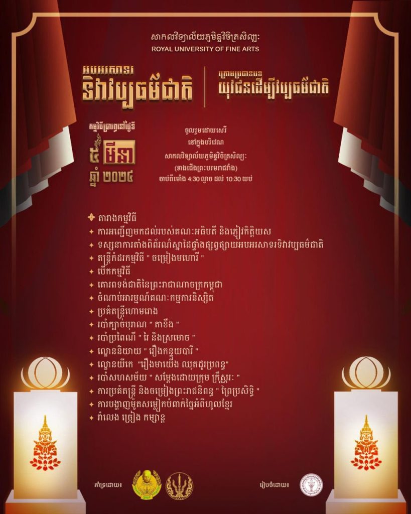 សាកលវិទ្យាល័យភូមិន្ទវិចិត្រសិល្ប:នឹងរៀបចំកម្មវិធីអបអរសាទរ ទិវាវប្បធម៌ជាតិ ក្រោមប្រធានបទ «យុវជនដេីម្បីវប្បធម៌ជាតិ»