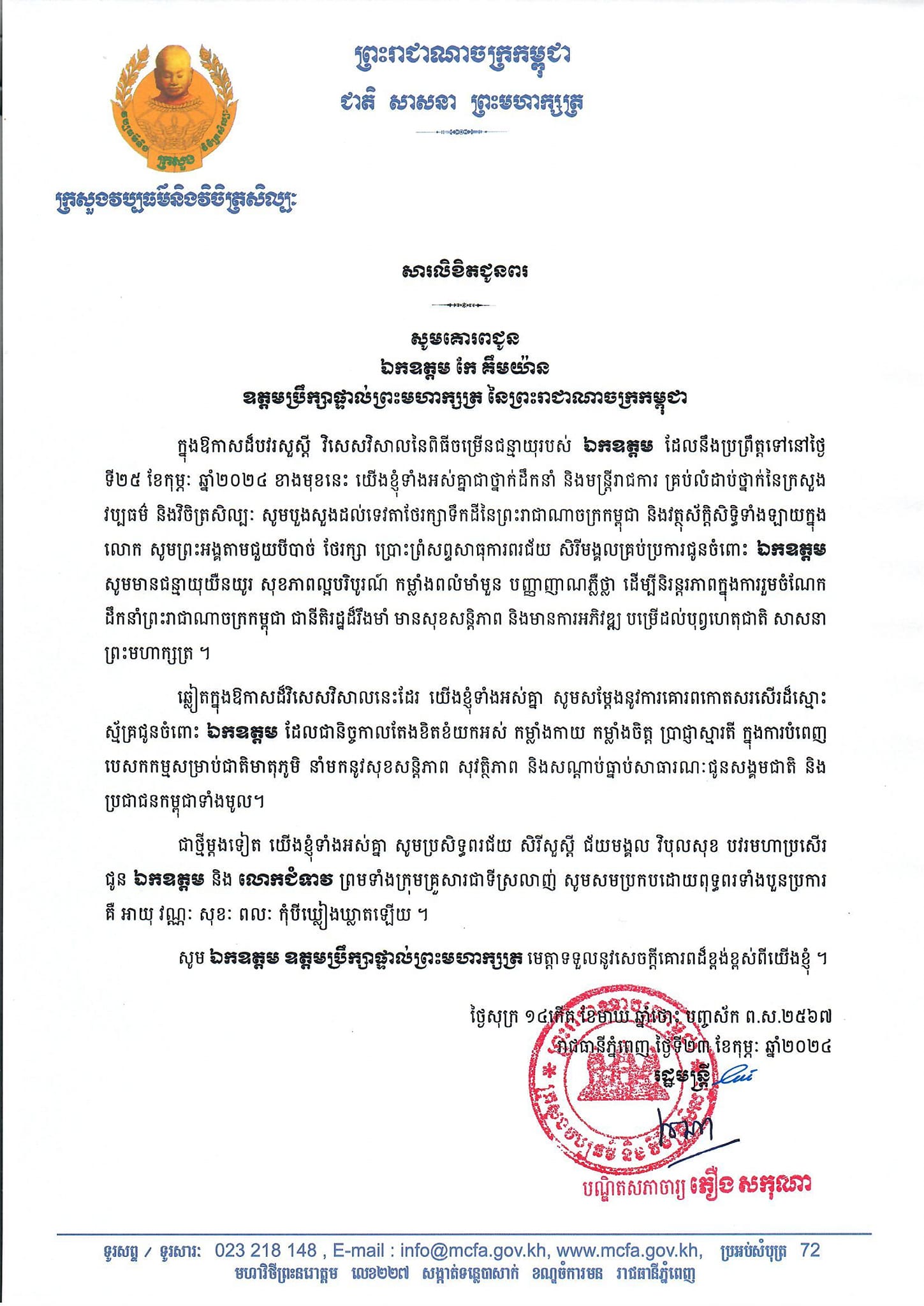 ក្នុងឱកាសដ៏បវរសួស្តី វិសេសវិសាលនៃពិធីចម្រើនជន្មាយុរបស់ ឯកឧត្តម ដែលនឹងប្រព្រឹត្តទៅនៅថ្ងៃ ទី២៥ ខែកុម្ភៈ ឆ្នាំ២០២៤ ខាងមុខនេះ យើងខ្ញុំទាំងអស់គ្នាជាថ្នាក់ដឹកនាំ និងមន្ត្រីរាជការ គ្រប់លំដាប់ថ្នាក់នៃក្រសួង វប្បធម៌ និងវិចិត្រសិល្បៈ សូមបួងសួងដល់ទេវតាថែរក្សាទឹកដីនៃព្រះរាជាណាចក្រកម្ពុជា និងវត្ថុស័ក្តិសិទ្ធិទាំងឡាយក្នុង លោក សូមព្រះអង្គតាមជួយបីបាច់ ថែរក្សា ប្រោះព្រំសព្ទសាធុការពរជ័យ សិរីមង្គលគ្រប់ប្រការជូនចំពោះ ឯកឧត្តម សូមមានជន្មាយុយឺនយូរ សុខភាពល្អបរិបូរណ៍ កម្លាំងពលំមាំមួន បញ្ញាញាណភ្លឺថ្លា ដើម្បីនិរន្តរភាពក្នុងការរួមចំណែក ដឹកនាំព្រះរាជាណាចក្រកម្ពុជា ជានីតិរដ្ឋដ៏រឹងមាំ មានសុខសន្តិភាព និងមានការអភិវឌ្ឍ បម្រើដល់បុព្វហេតុជាតិ សាសនា ព្រះមហាក្សត្រ ។