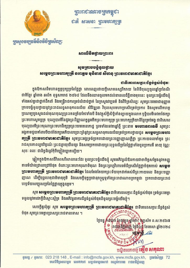 សារលិខិតថ្វាយព្រះពររបស់លោកជំទាវបណ្ឌិតសភាចារ្យរដ្ឋមន្ត្រី សូមក្រាបបង្គំទូលថ្វាយ សម្តេចព្រះមហាក្សត្រី នរោត្តម មុនិនាថ សីហនុ ព្រះវររាជមាតាជាតិខ្មែរ ក្នុងឱកាសដ៏មហានក្ខត្តឫក្សប្រពៃថ្លៃថ្លា ពោរពេញដោយក្តីសោមនស្សរីករាយ នៃពិធីបុណ្យចូលឆ្នាំប្រពៃណី ជាតិខ្មែរ ឆ្នាំរោង ឆស័ក ពុទ្ធសករាជ ២៥៦៨