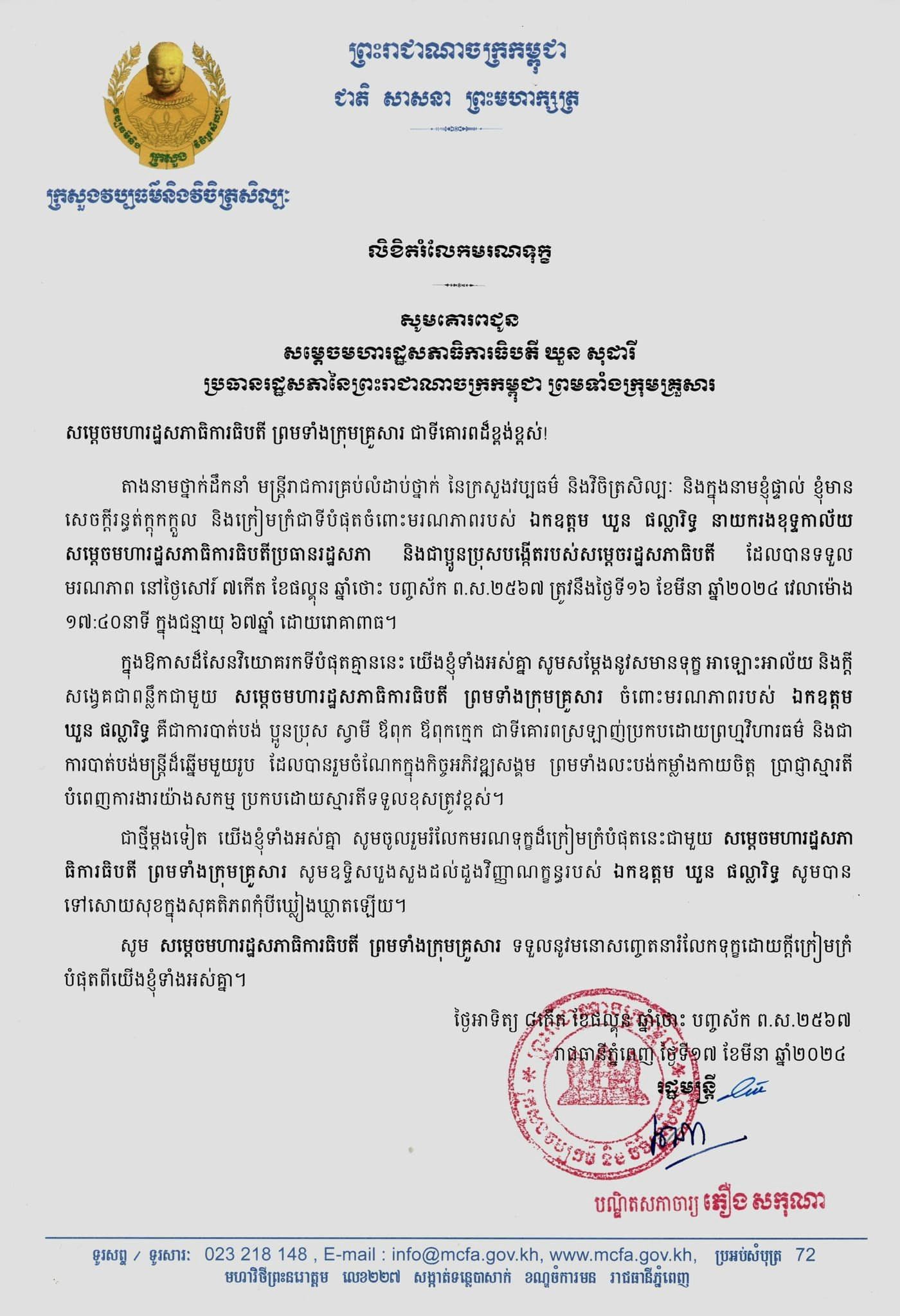 សារលិខិតរំលែកទុក្ខ របស់ថ្នាក់ដឹកនាំ និងមន្ត្រីរាជការទាំងអស់នៃក្រសួងវប្បធម៌ និងវិចិត្រសិល្បៈ គោរពជូន សម្តេចមហារដ្ឋសភាធិការធិបតី ឃួន សុដារី ប្រធានរដ្ឋសភា នៃព្រះរាជាណាចក្រកម្ពុជា ចំពោះមរណភាពរបស់ ឯកឧត្តម ឃួន ផល្លារិទ្ធ ដែលត្រូវជាប្អូនប្រុសបង្កើតរបស់ សម្តេចរដ្ឋសភាធិបតី កាលពីថ្ងៃសៅរ៍ ៧កើត ខែផល្គុន ឆ្នាំថោះ បញ្ចស័ក ព.ស.២៥៦៧ ត្រូវនឹងថ្ងៃទី១៦ ខែមីនា ឆ្នាំ២០២៤ វេលាម៉ោង ១៧:៤០ នាទី ក្នុងជន្មាយុ ៦៧ឆ្នាំ ដោយរោគាពាធ។