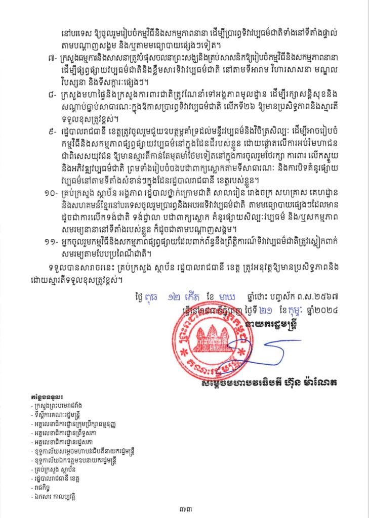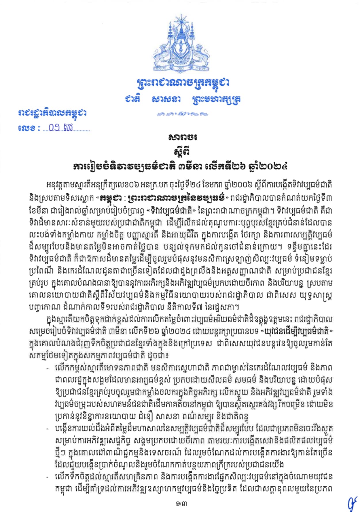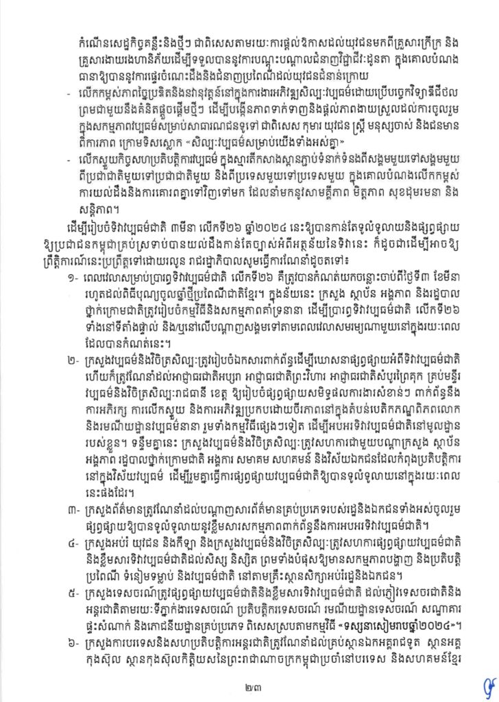 សារាចរ របស់រាជរដ្ឋាភិបាលកម្ពុជា ស្តីពីការរៀបចំទិវាវប្បធម៌ជាតិ ៣មីនា លើកទី២៦ ឆ្នាំ២០២៤ ក្រោមប្រធានបទ យុវជនដើម្បីវប្បធម៌ជាតិ ។