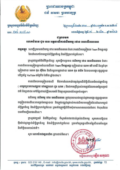 សេចក្តីព្រមានផលិតកម្ម ថោន អេនធើធេនមេន ចំពោះការផលិតចម្រៀងបទ Team ទឹកត្នោតជូរ ដែលរំលោភបំពានច្បាប់សិទ្ធិអ្នកនិពន្ធ និងសិទ្ធិប្រហាក់ប្រហែល