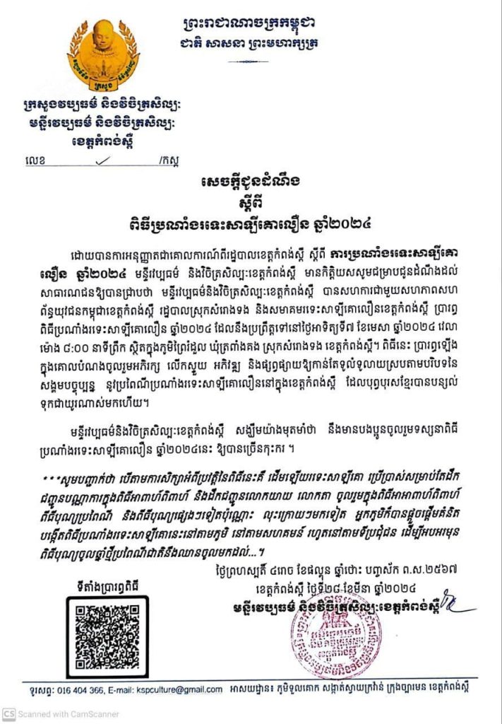 ស្តីពីពិធីប្រណាំងរទេះសាឡីគោលឿន ឆ្នាំ២០២៤ នៅថ្ងៃអាទិត្យ ទី៧ ខែមេសា ឆ្នាំ២០២៤ វេលាម៉ោង ៨:០០ នាទីព្រឹក ស្ថិតក្នុងភូមិព្រៃរំដួល ឃុំត្រពាំងគង ស្រុកសំរោងទង ខេត្តកំពង់ស្ពឺ…៕